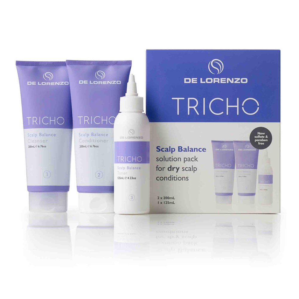 The Tricho Scalp Balance Solutions Pack offers a straightforward three-step treatment regimen designed for individuals dealing with dry scalp conditions. This comprehensive pack includes a cleanser, conditioner, and toner, all meticulously crafted to alleviate symptoms like itching, dandruff, psoriasis, redness, scaling, and issues related to stress.