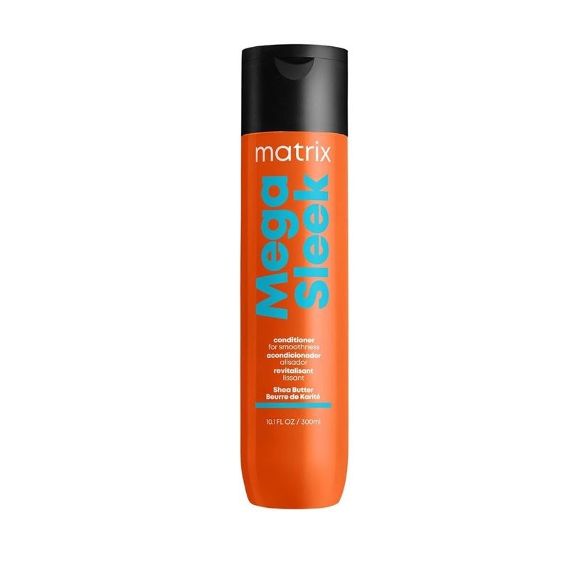 Matrix Total Results Mega Sleek Conditioner with smoothing shea butter helps control rebellious, unruly hair and manages frizz against humidity for smoothness.